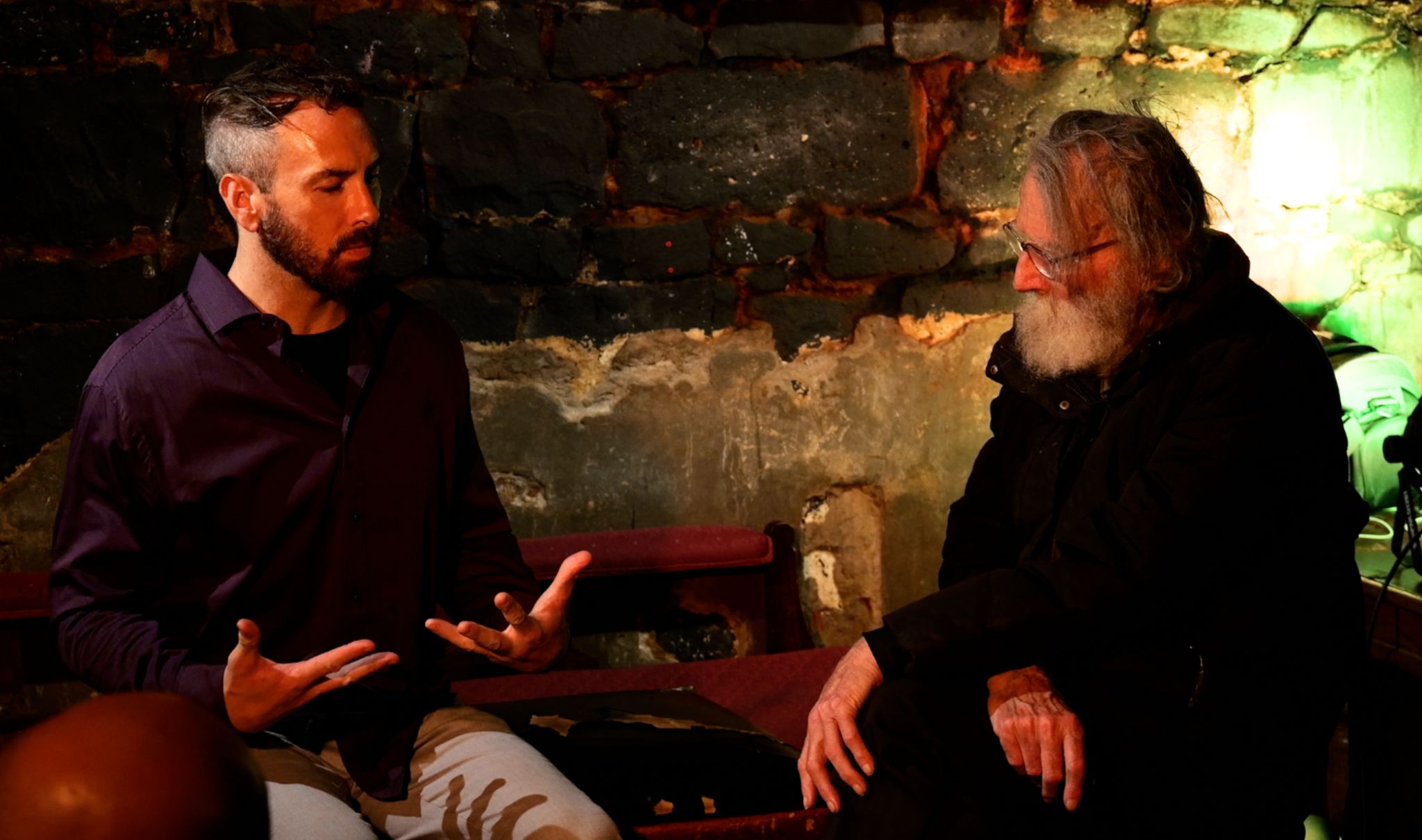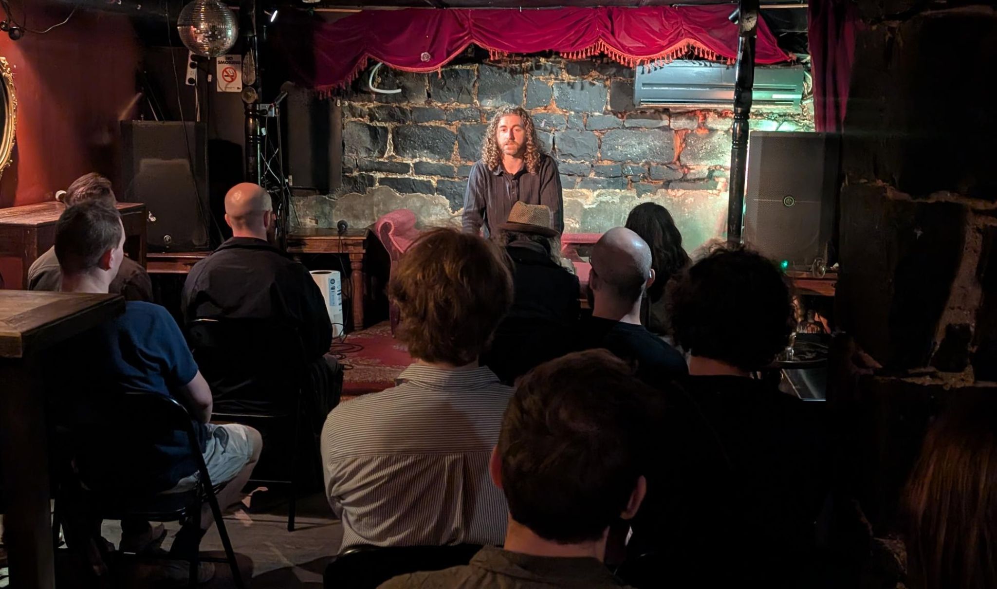 Attendees take a seat in front of a small stage in the underground vault beneath a cocktail bar. Throughout the evening, members of the audience and the Voicecraft Network will rotate places in dialogue on stage. Your spoken participation is optional.